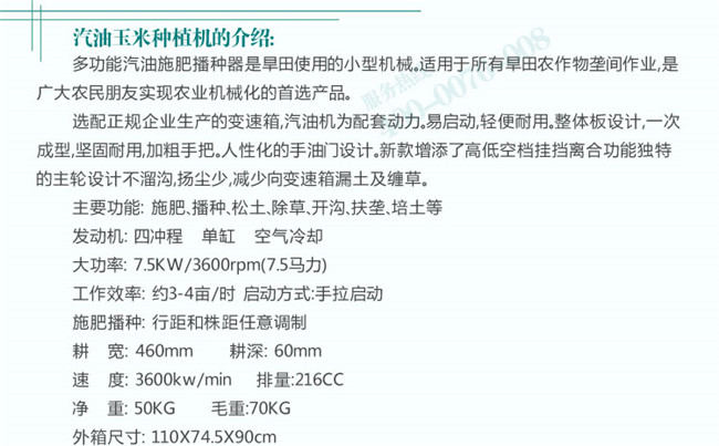 點播原種,直播毛仔,一次成功,每小時1~1.5畝,設計合理不存在缺陷。更換樓心,可以播種棉花,玉米,大豆,豆角、高粱、谷子等。調(diào)整手柄,播種量大,小隨意可調(diào)。