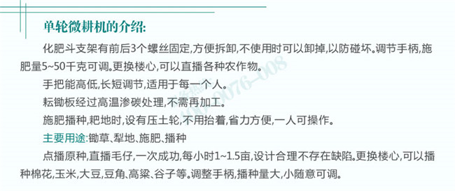 4.化肥斗支架有前后3個螺絲固定,方便拆卸,不使用時可以卸掉,以防碰壞。獨創(chuàng)的分離設計,三角帶傳動,不存在頂鏈條的問題。播種施肥可雙行,單行,前后使用,耘地施肥可同時進行。調(diào)節(jié)手柄,施肥量5~50千克可調(diào)。更換樓心,可以直播各種農(nóng)作物。